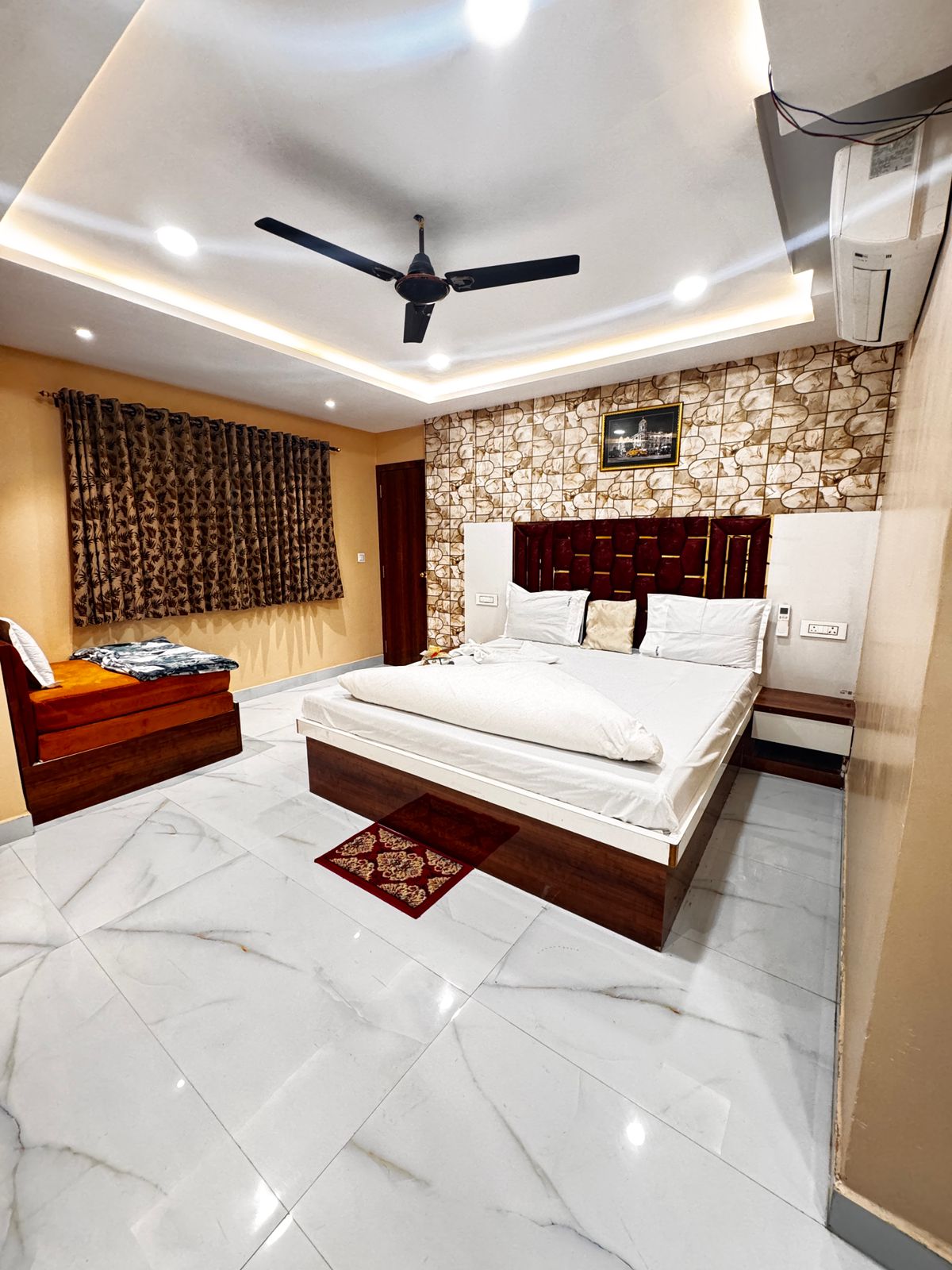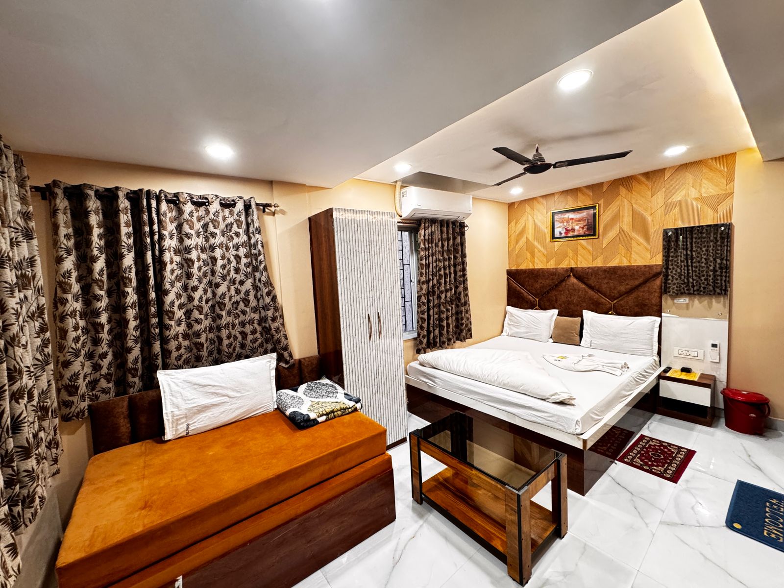 Extra-large room with luxury furnishings, AC, balcony view, and space for 4–5 guests.